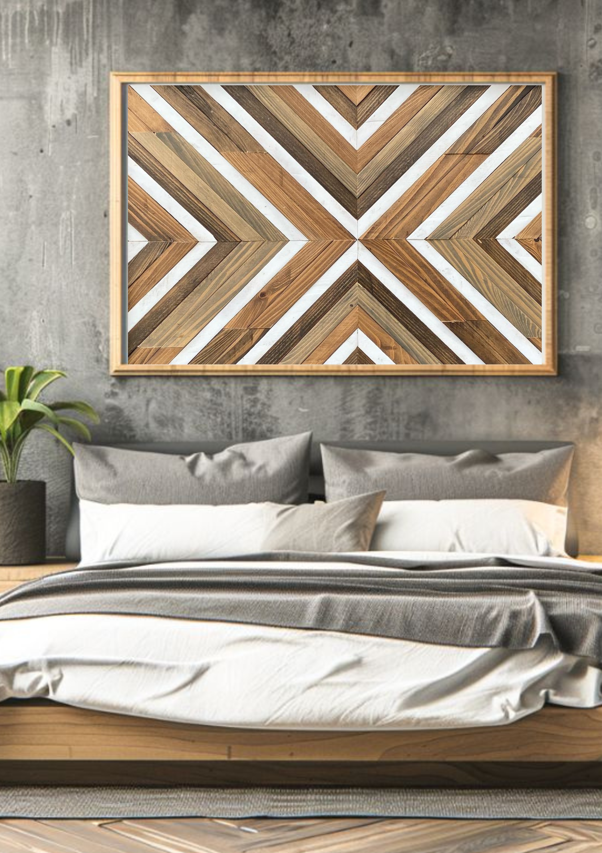 This piece layers warm walnut and golden pine in sharp symmetry, broken only by crisp white lines that make the whole design breathe. It’s minimal, earthy, and works in nearly any color scheme — especially bright, clean interiors.